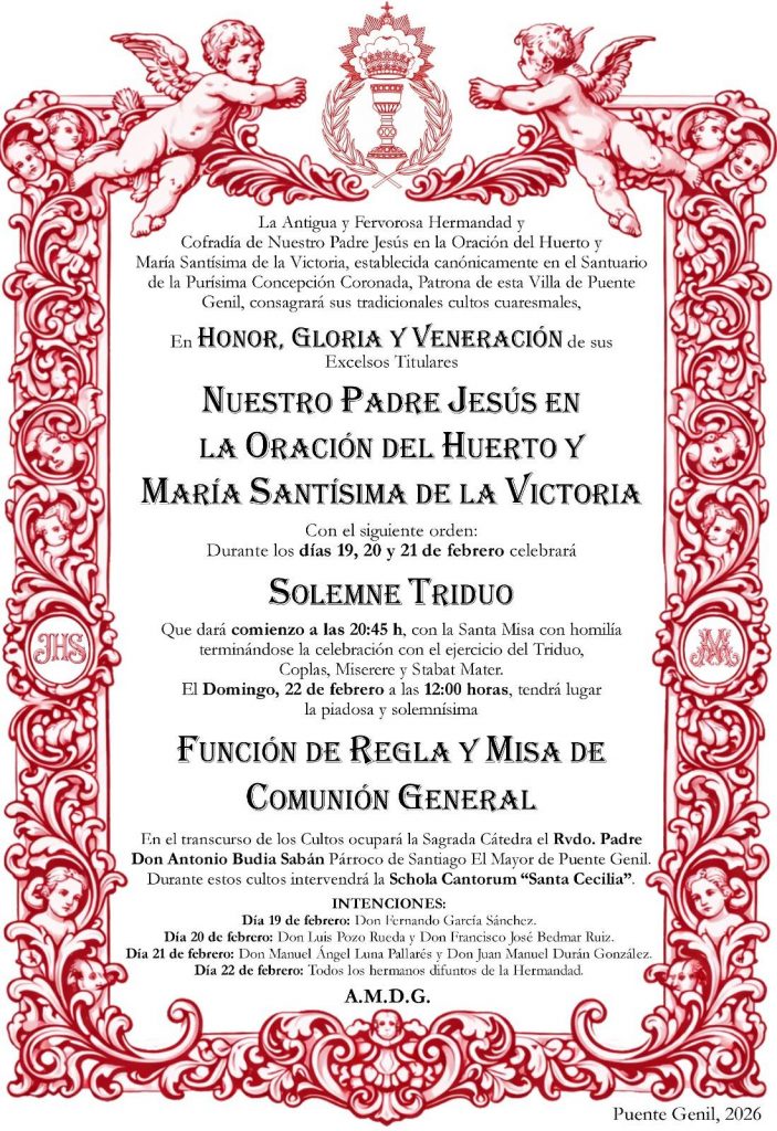 Noticias Cultos Cofradía del Huerto y Mª Stmª de la Victoria 18 de febrero de 2026 Navegación de entradas Anterior: Jueves Lardero 2026